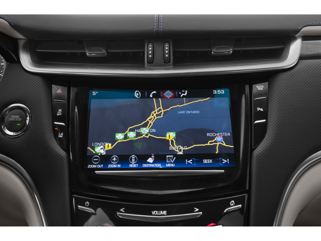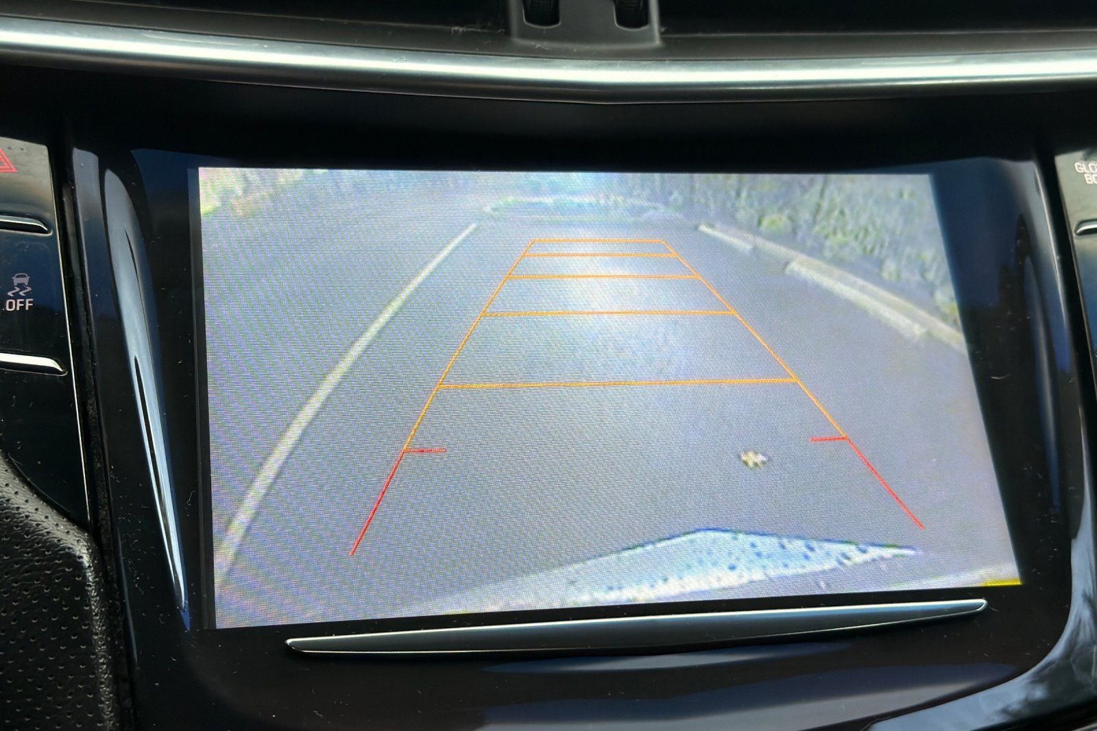 - Cadillac CUE Information and Media Control System 8" display, featuring touch response, haptic feedback, gesture recognition, proximity sensing, articulating storage door/bin, clock display and compass feature