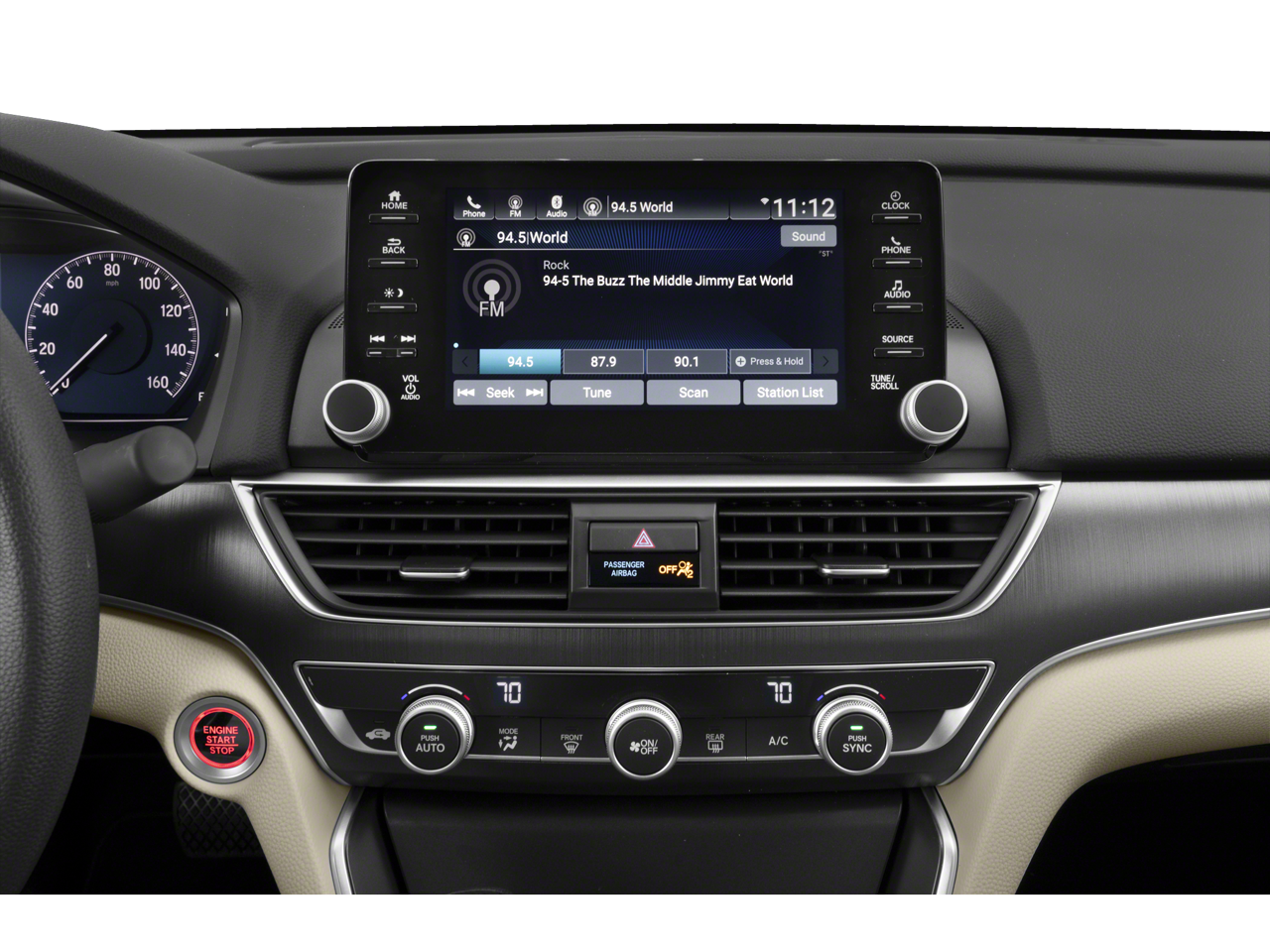 • Radio: 160-Watt AM/FM Audio System -inc: 4 speakers, 8" display audio w/high-resolution electrostatic touch-screen, knobs and hard keys for primary controls and customizable feature settings, Bluetooth® HandsFreeLink, Bluetooth® streaming audio, Radio Data System (RDS), Speed-Sensitive Volume Compensation (SVC), HondaLink, Apple CarPlay integration, Android Auto integration, 2 2.5-amp USB smartphone/audio interface ports in front console, illuminated steering wheel-mounted controls and body-colored fin-type roof-mounted antenna